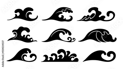 Fototapeta premium Set of sea wave silhouette isolated on white background.