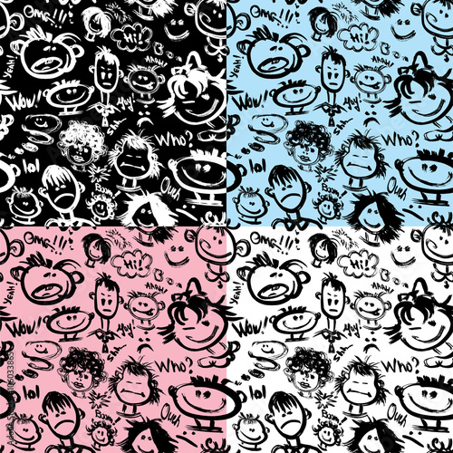 © lian_2011, Fototapeta premium Set of seamless patterns. Cartoon faces with different emotions.