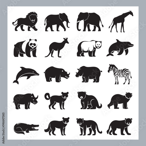 © IFTIAR, Obraz premium Set of silhouette logotype icons animal Lion, Elephant, Tiger, Giraffe, Kangaroo, Panda, Gorilla, dolphin, cat, deer, Polar Bear, Zebra, fox in white background