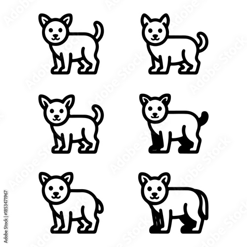© Kapten Safor Ali, Fototapeta premium Set of six charming dog line art icons in minimalist black and white style illustrating various standing puppy figures perfect for pet related graphic design and children's projects