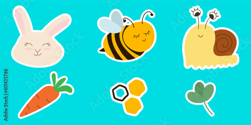 Naklejka premium Set of six cute hand drawn baby stickers consisting of a sleepy bee, a cute bunny, a curious snail, a carrot, a leaf and a honeycomb