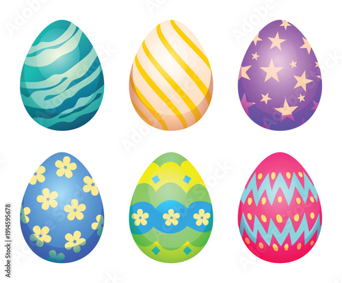 Fototapeta premium Set of six decorative Easter eggs featuring stars, flowers, and geometric zigzag lines. Vector cartoon illustration