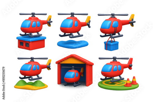 Fototapeta premium Set of six red and blue toy helicopters. The helicopters are all different sizes and are positioned in various poses. Concept of playfulness and fun