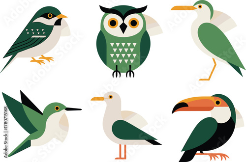 © MD. HASAN ALI, Naklejka premium Set of six stylized birds Keywords: bird, owl, hummingbird, toucan, seagull, sparrow, green