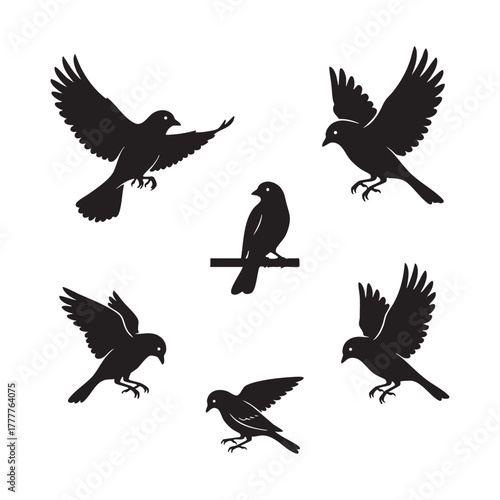 Obraz premium Set of Small Bird Silhouettes Flying and Perching Vector Illustration
