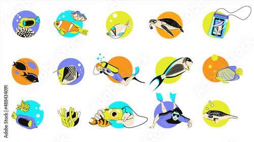 © Ирина Тюжина, Naklejka premium Set of snorkeling and diving elements, fishes, scuba diver, corals, underwater camera case, underwater photography. Vector illustration isolated on white background.