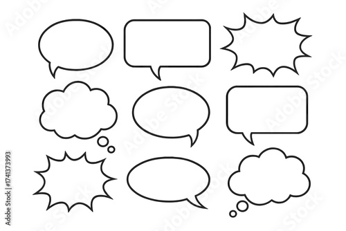 © Zara, Fototapeta premium Set of speech bubbles, blank retro empty comic bubbles and thought clouds. Vector illustration for dialog, chat, message or communication. Pop art comics style design elements.