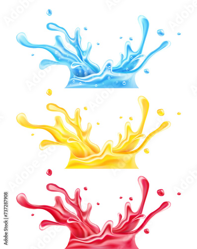 Fototapeta premium Set of splashes of clean drinking mineral water orange and raspberry juices....