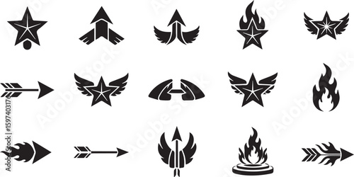 Fototapeta premium Set of star and arrow symbols, black silhouette on white background