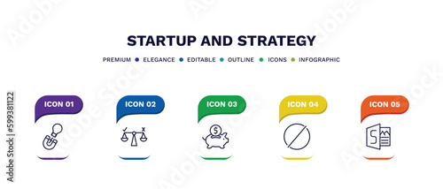 © Abstract, Naklejka premium set of startup and strategy thin line icons. startup and strategy outline icons with infographic template. linear icons such as idea magnet, decision, piggybank, restrict, sway vector.