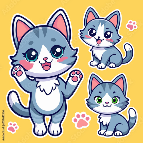 © Veronica, Fototapeta premium Set of stickers with cute gray kitties in anime style