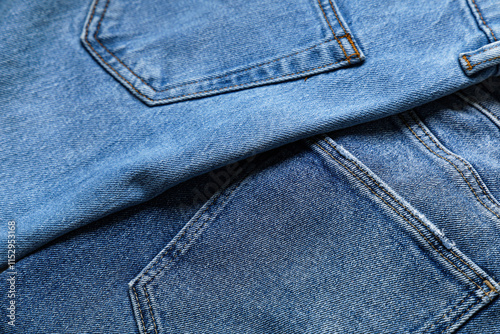 © Pixel-Shot, Naklejka premium Set of stylish blue jeans as background, closeup