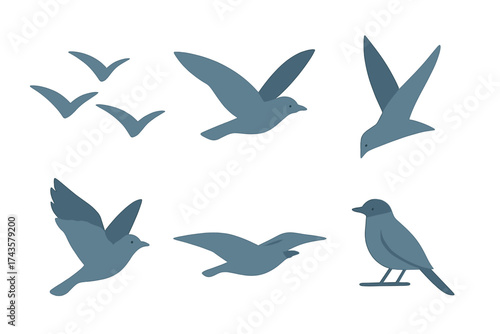 Fototapeta premium Set of stylized blue-gray bird silhouettes showing flight and resting poses