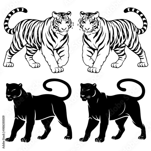 © Anabella, Naklejka premium Set of stylized vector illustrations featuring two white tigers and two black panthers in a walking pose, rendered in bold black-and-white line art with mirrored symmetry.