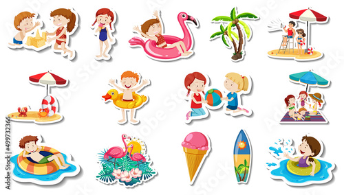 © blueringmedia, Obraz premium Set of summer beach items and children