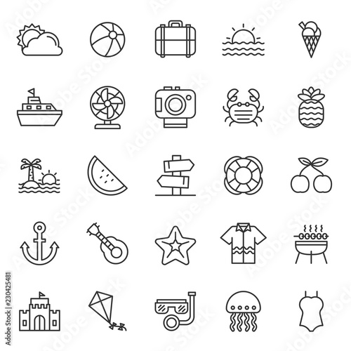 © Fuadi Alhusini, Naklejka premium set of summer holiday party icon, with simple outline and modern concept, editable stroke, use for travel reservation web assest and infographic pictogram, toursim, traveling, beach party celebrate