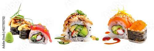 Fototapeta premium set of sushi rolls with various fillings and garnishes, isolated on...