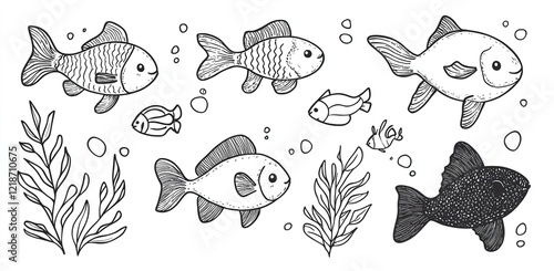 Naklejka premium Set of sweet hand-drawn fish in line art style designed as vector icons.