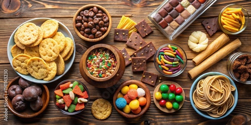 © Udomner, Fototapeta premium set of sweets including chocolate, cookies, candy, potato chips, and pudding, sweets, s, set, chocolate, cookies, candy