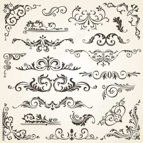 © the8monkey, Naklejka premium set of Swirl Elements for design. Calligraphic page decoration, Labels, banners, antique and baroque Frames floral ornaments. Old paper