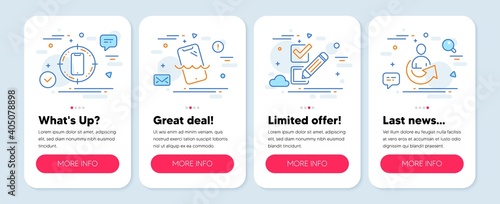© blankstock, Fototapeta premium Set of Technology icons, such as Checkbox, Smartphone waterproof, Smartphone target symbols. Mobile screen mockup banners. Share line icons. Survey choice, Phone, Referral person. Vector
