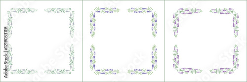 Fototapeta premium Set of three elegant green vegetal ornamental frame with purple glycinin...