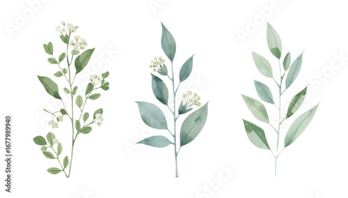 © Mamer, Fototapeta premium Set of three elegant watercolor botanical illustrations featuring lush green leaves and delicate white blossoms, perfect for natural design projects