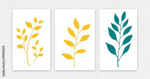 © kkkiim graphic, Fototapeta premium Set of three minimalist vector graphics featuring plant designs in flat yellow and teal colors against a white background.