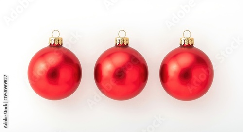 Fototapeta premium Set of three polished red Christmas tree decorations aligned on white background ideal for holiday ornament displays