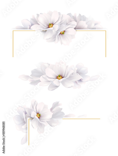 © artant, Fototapeta premium Set of three version design of decoration invitation or congratulation cards with elegant flower composition. Blooming white magnolias on the white background.