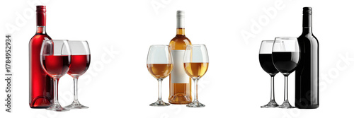 © imagify, Fototapeta premium Set of Three wine bottles and glasses on a white background. isolated on a transparent background.