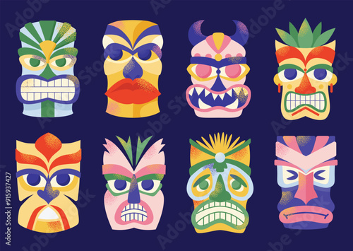 Naklejka premium Set of tiki masks. Cartoon ceremonial tiki totem masks, Wooden Totems, Ornamental Hawaiian Mask, Fantasy African Mask Sculpture. Vector illustrations Ethnic tribal ritual masks isolated on background