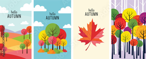 © hamid, Fototapeta premium Set of trendy art style abstract autumn poster, cover, card with bright beautiful leaves, plants, autumn forest landscape.