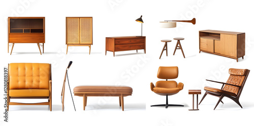 Fototapeta premium Set of trendy sofas, armchairs, with cushions in retro mid-century style. Modern soft furniture collection