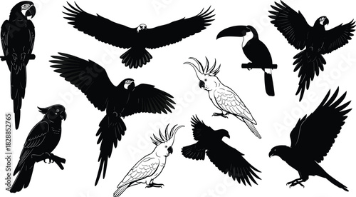 © Farzana, Naklejka premium Set of tropical bird black silhouettes and outlines, macaw, toucan, eagle and cockatoo vector illustration collection for zoo logo or wildlife design.