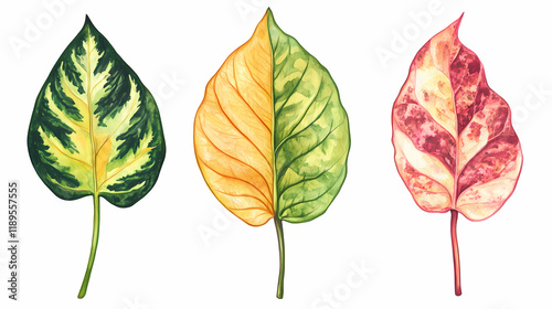 © Thiago, Obraz premium Set of tropical leaves collection on white background. Leafglow. Illustration