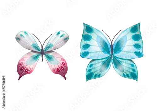 © Diasha Art, Naklejka premium Set of two abstract butterflies with beautiful wings.Watercolor illustration for designers, typography, books, cards, for print.