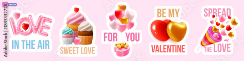 © Pagina, Fototapeta premium Set of Valentines Day design elements, labels, stickers. Romantic cute 3d conceptual objects, hearts, gifts, balloons, cupcake, party popper and typography lettering. Isolated Vector illustration