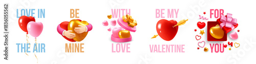 © Pagina, Naklejka premium Set of Valentines Day poster, cover, banner or greeting card templates. Romantic cute design, 3d realistic conceptual objects, hearts, gifts, balloons and typography lettering. Vector illustration