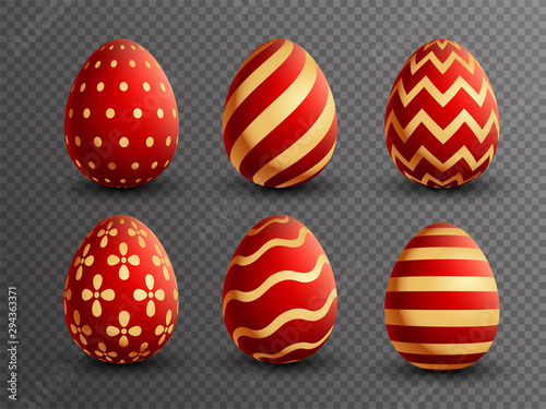 Fototapeta premium Set of various design of painted eggs in red and golden color.