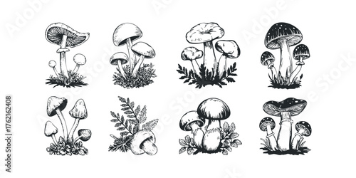 Fototapeta premium Set of various hand drawn mushrooms with foliage