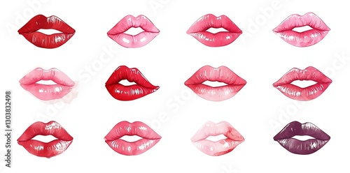 © Shelley, Naklejka premium Set of various pink and red lipstick kiss prints isolated on white, symbolizing Valentine's love.