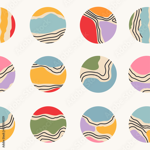 © Dariia, Naklejka premium Set of various Vector Hand drawn Round icons. Abstract colorful background. Various shapes, lines, curves, doodles. Square seamless Pattern