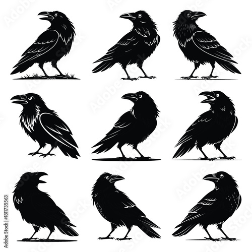 © SreeRaton, Obraz premium Set of vector black cheeky crow silhouette icon. Isolated black animal shape design element.