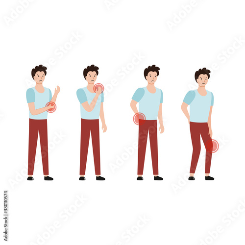 Naklejka premium Set of vector illustrations. The man complains of pain in the joints, muscles...