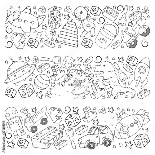 © helen_f, Obraz premium Set of vector toys for little children. Ufo, submarine. Cartoon dinosaur. Kindergarten kids.