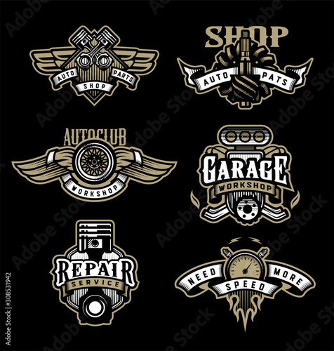Obraz premium Set of vintage monochrome auto emblems, badges, logos on a dark background.