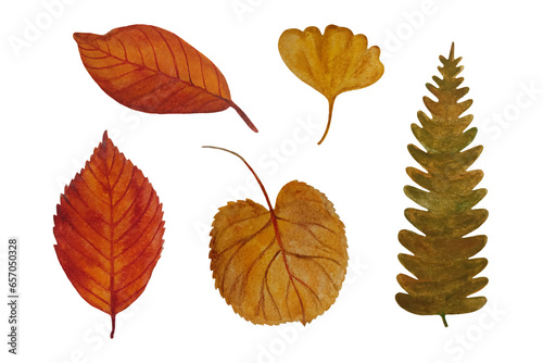 Fototapeta premium Set of watercolor autumn leaves isolated on white background. Floral and natural botanical element. Watercolor illustration.