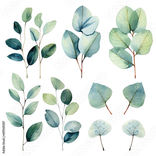 Fototapeta premium Set of watercolor eucalyptus leaves. Collection of watercolor delicate...