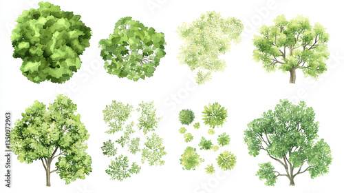 © suldev, Fototapeta premium Set of watercolor green tree isolated on white background for landscape and architecture drawing, elements for environment and garden, botanical for section in spring
